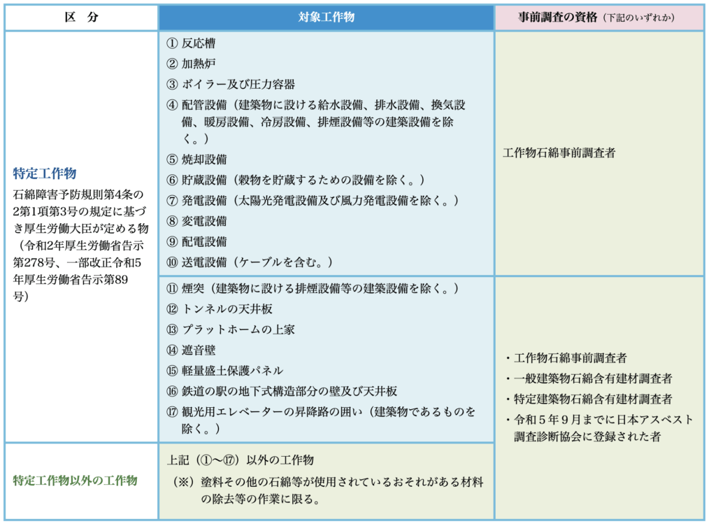 具体的には、令和2年厚生労働省告示第278号(「工作物石綿事前調査者関係」告示)に列記されており、各対象工作物に対し、事前調査を実施することができる者は下表のとおりである。
